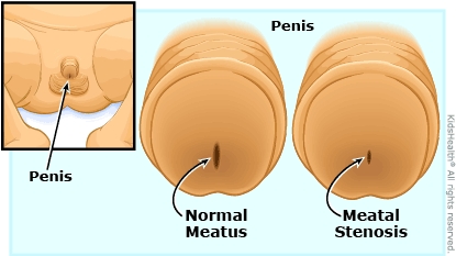 What causes meatal stenosis? Meatal stenosis can happen when irritation causes a scar to form at the meatus. This makes the opening smaller. The irritation may come from rubbing against a diaper, an injury to the penis, or having a catheter (a plastic tube that lets the pee flow out of the body) in place for a long time. Meatal stenosis is more likely to happen in boys who are circumcised.