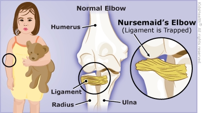 Nursemaid's elbow happens when a ligament (a stretchy band that joins two bones) gets trapped. Sometimes it gets unstuck by itself. In most cases, a health care provider gets the ligament back in place by doing a quick, gentle move of the arm. To help prevent nursemaid's elbow, always pick up your child from under the armpits and not by the hands or arms.