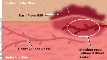 In Henoch-Schönlein purpura (HSP), small blood vessels in the body become swollen and irritated. These inflamed blood vessels in the skin can leak red blood cells, causing purpura, which is a raised, reddish-purple rash that looks like bruises. The rash usually appears on the legs and buttocks, but can also show up on other parts of the body.