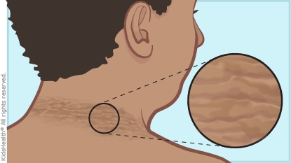 In acanthosis nigricans, kids get thick, dark, and sometimes streaky patches on their skin. The patches might feel like velvet. They usually affect areas with skin folds, such as the neck, armpits, elbows, knees, and groin, but they can appear anywhere on the body. They are not contagious. Sometimes parents or children may think the dark skin is dirty, but it isn't. Scrubbing the skin does not help and can cause irritation.