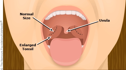 Tonsils are small glands on either side of the back of the throat. They are part of the immune system and help with fighting infection. Lots of kids have enlarged tonsils, and this usually doesn't cause any harm. But if your child develops problems like snoring, poor sleep, or trouble swallowing, tell your health care provider. Treatment might help.