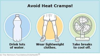 To help prevent heat cramps and other heat illnesses, encourage your child to:
