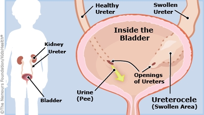 A ureterocele is a small bulge or a swelling at the end of the ureter that forms while a baby is developing in the womb. The ureter is the tube that carries urine (pee) from the kidney to the bladder. Some people with a ureterocele don't have any symptoms. But if the ureterocele blocks the flow of pee from the kidney to the bladder, it can lead to urinary tract infections (UTIs) and other symptoms.