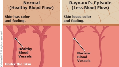 Does a person with Raynaud's always have the same skin color-changing pattern? No. The skin typically changes from white to blue/purple to red. But in some kids, all these colors may not happen, or the color changes may happen in a different order.