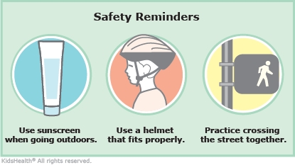 Have your child wear a helmet when biking, riding a skateboard or scooter, skating, skiing, snowboarding, or horseback riding, or when in a child carrier on an adult bike.