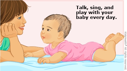 To communicate means to share thoughts, ideas, and feelings. We communicate through sounds, words, facial expressions, and touch. Babies this age can communicate through body language, smiles, laughter, crying, and babbling. Talking, singing, and touching your baby all strengthen the bond between you and help your baby learn to communicate.