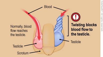 With testicular torsion, one of the testicles twists inside the scrotum. This twisting blocks blood flow to the testicle and if it's not treated right away, can cause permanent damage. Sometimes a testicle twists and untwists on its own before any damage happens — this is called intermittent testicular torsion. Testicular torsion is a medical emergency, so if it seems like the torsion is happening again, go to the emergency room right away. Don't wait to see if the torsion goes away on its own.