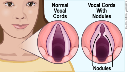 Vocal cord nodules are small lumps that develop on the vocal cords. They happen when the vocal cords are strained repeatedly, often from yelling, talking, or singing a lot.
