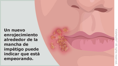 Su hijo tiene un dolor fuerte en la piel infectada; las manos, los pies o la cara hinchados; la orina contiene algo de sangre. En muy raras ocasiones, el impétigo puede extenderse a partes más profundas de la piel o afectar los riñones.