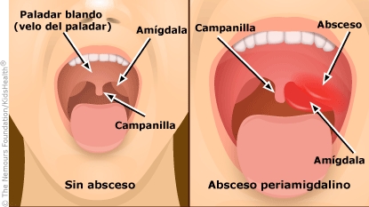 Los abscesos periamigdalinos son una acumulación de pus alrededor de las amígdalas. Son causados por bacterias (un tipo de germen). Una persona con un absceso periamigdalino tiene un fuerte dolor de garganta y también puede babear, tener fiebre, la voz apagada o afónica, dificultad para abrir la boca o tragar, o incluso dificultades para respirar. Con tratamiento, la mayoría de los abscesos periamigdalinos se curan completamente.