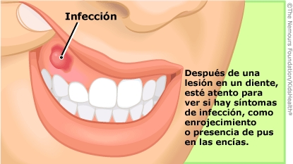 ¿Qué puede ocurrir por las lesiones en los dientes permanentes? Una lesión en un diente permanente puede hacer que el diente cambie de color o de posición. También puede causar una infección en el diente. Con tratamiento inmediato, con frecuencia es posible salvar un diente permanente lesionado.