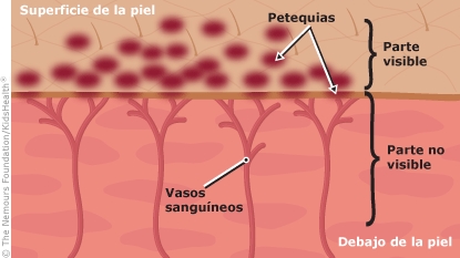 ¿Cuáles son las causas de las petequias? Las petequias aparecen cuando los pequeños vasos sanguíneos (llamados capilares) de la piel se rompen y sangran. Existen muchas causas para la aparición de petequias y la mayoría de ellas no son graves. Cuando una persona tose, llora o vomita, la presión de los vasos sanguíneos se eleva y estos pequeños vasos se rompen. Frotar, pellizcar o succionar la piel también puede provocar la rotura de esos pequeños vasos sanguíneos. Las petequias también pueden deberse a ciertos medicamentos, a una infección viral o bacteriana (tipos de gérmenes) o una enfermedad que hace que el cuerpo tenga menos plaquetas (un tipo de células sanguíneas que ayudan a detener el sangrado).