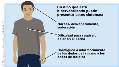 La hiperventilación consiste en respirar demasiado rápido u hondo. Un niño que hiperventila puede sentir que le falta el aire, sudar mucho, desmayarse, tener dolor en el pecho, experimentar espasmos musculares, hormigueo o entumecimiento en los dedos de las manos o de los pies, o sentir ansiedad.