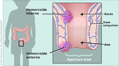 Las hemorroides son venas inflamadas en el recto (hemorroides internas) o en el ano (hemorroides externas). En los niños, la mayoría de las hemorroides son externas y se deben al estreñimiento. El estreñimiento ocurre cuando los niños no tienen movimientos de vientre con la frecuencia habitual o cuando les cuesta ir de cuerpo porque las heces están secas y duras. La diarrea, sentarse en el inodoro durante demasiado tiempo o hacer fuerza para ir de cuerpo también pueden causar hemorroides.