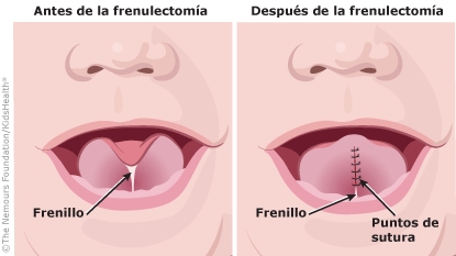 Es posible que su hijo sangre un poco por debajo de la lengua durante algunas horas después de la cirugía. También puede haber algo de inflamación y molestias, pero esto debería mejorar en unos cuantos días. Si su hijo tiene puntos de sutura debajo de la lengua, se disolverán a medida que se cure el lugar de la cirugía. No es necesario que el médico quite los puntos.