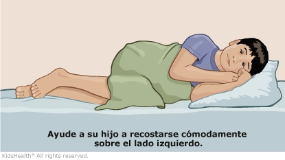 Coloque a su hijo en la posición correcta: recueste a su hijo sobre su lado izquierdo con las rodillas dobladas y coloque una toalla o almohadilla debajo de sus nalgas.