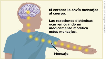Una reacción distónica es un tipo de efecto secundario de ciertos medicamentos. Provoca tensión, torsión o movimientos incontrolables de los músculos. Una reacción distónica ocurre porque el medicamento produce un desequilibrio en las sustancias químicas del cerebro. Este desequilibrio modifica los mensajes que el cerebro envía a los músculos.